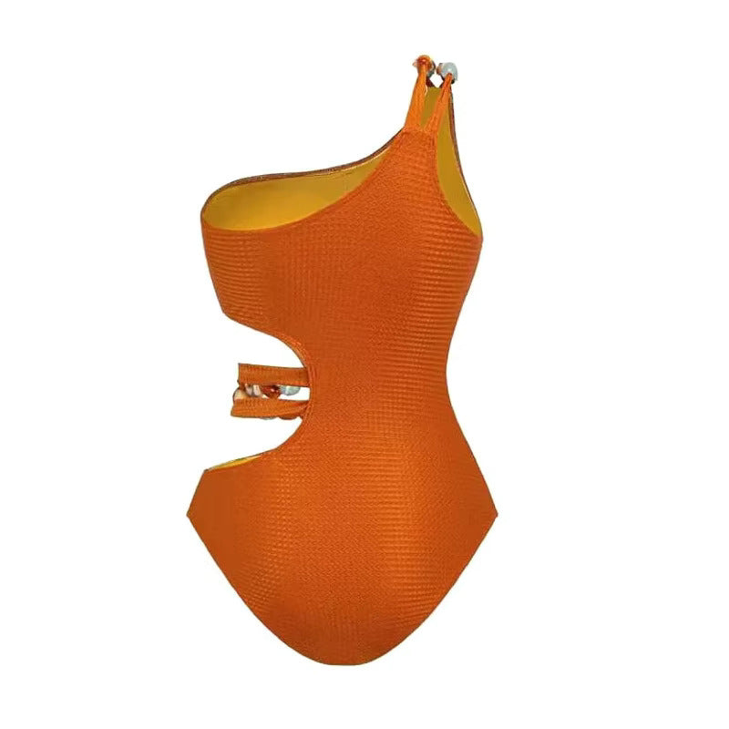 Embrace the elegance of the SunsetLux one-piece swimsuit, featuring a stunning sunset orange hue. This sophisticated design boasts a one-shoulder silhouette and is crafted from luxury, stretchy fabric for a perfect fit.